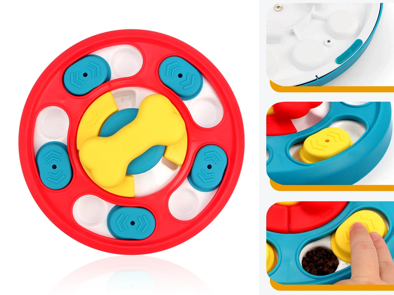 Le plateau contient plusieurs compartiments cachés que le chien doit ouvrir ou découvrir en faisant tourner l’os. Idéal pour activer son odorat et solliciter ses capacités de réflexion. -